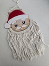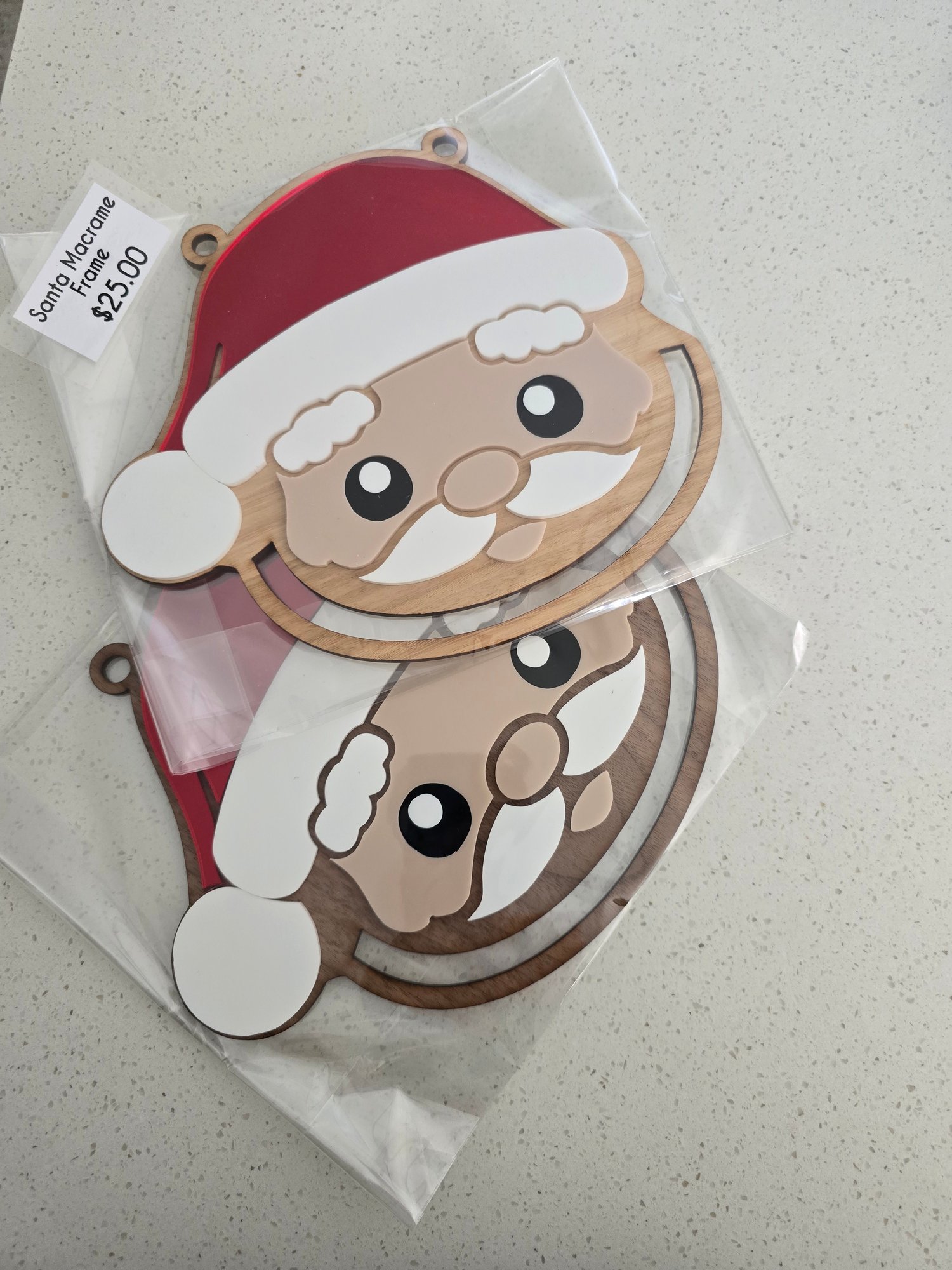 This adorable Santa features a wooden frame with layered acrylic details and a soft macramé beard! Perfect for festive décor or as a DIY project.