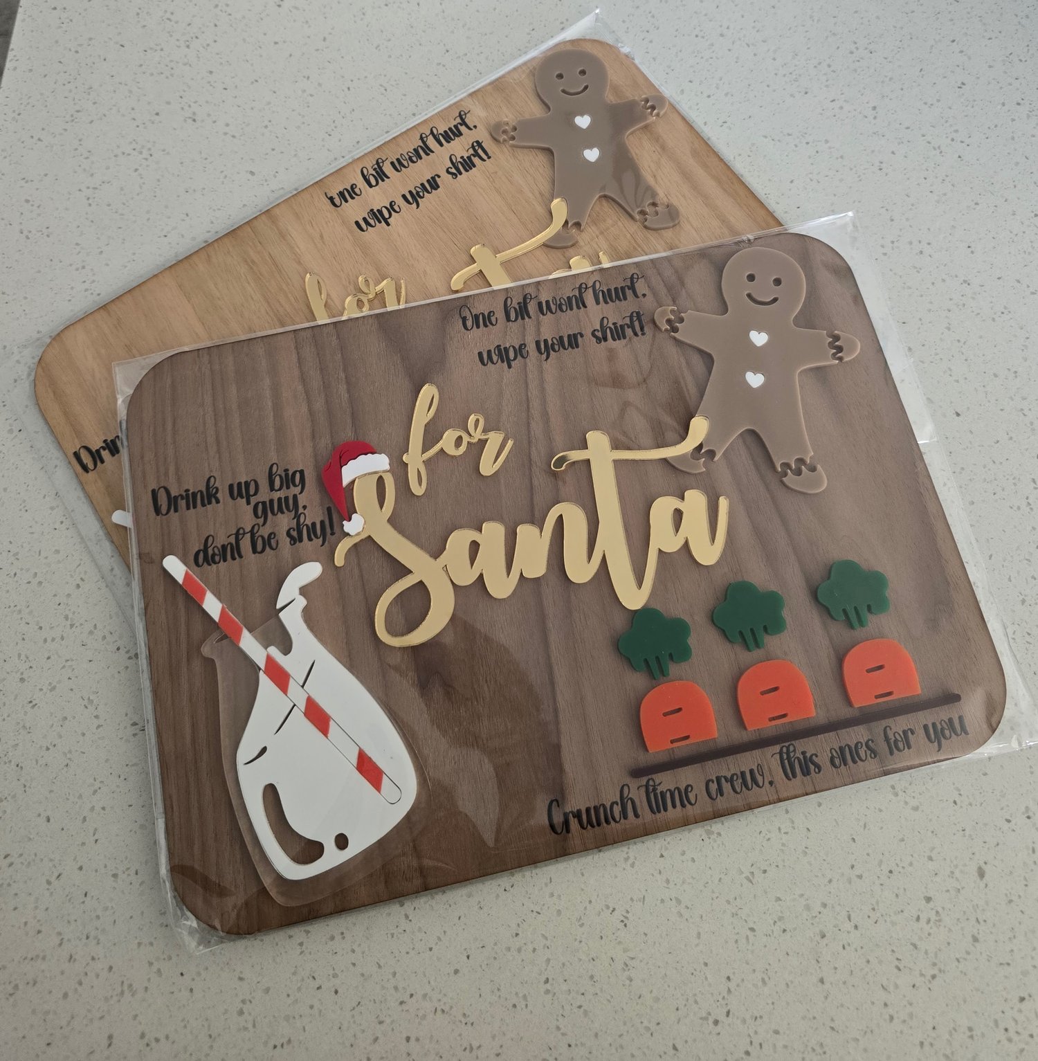 Each board is laser-cut and handcrafted with layered acrylic details. The perfect spot for Santa’s milk, cookie, and a few carrots for the reindeer crew 🥕